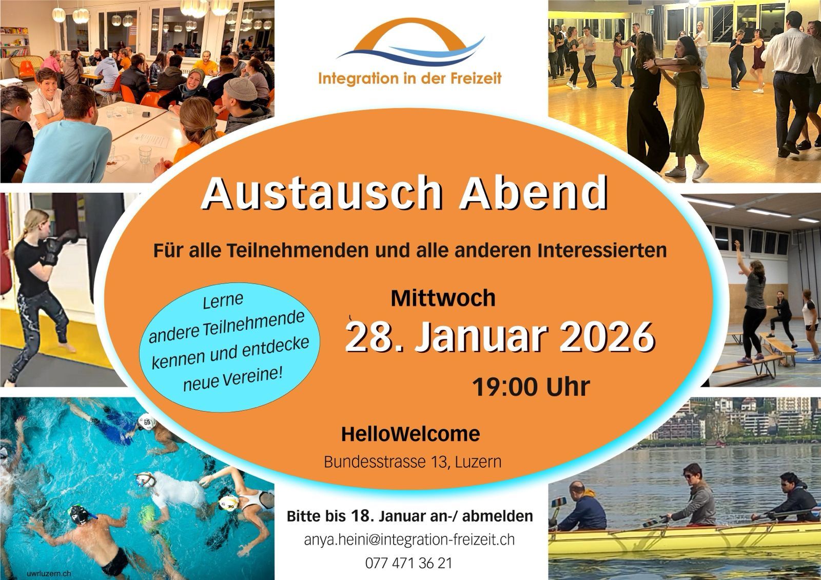 ZUM TEILEN – Integration in der Freizeit hilft geflüchteten Menschen eine Freizeitaktivität in Luzern zu besuchen. Am Austauschabend vom 28. Januar erfahren interessierte Personen mehr über die verschiedenen Vereine und Freizeitmöglichkeiten. Voraussetzungen: mind. 19 Jahre alt, wohnhaft in Luzern oder Agglo und Deutsch auf Niveau A1. Anmeldung bis Sonntag, 18. Januar.